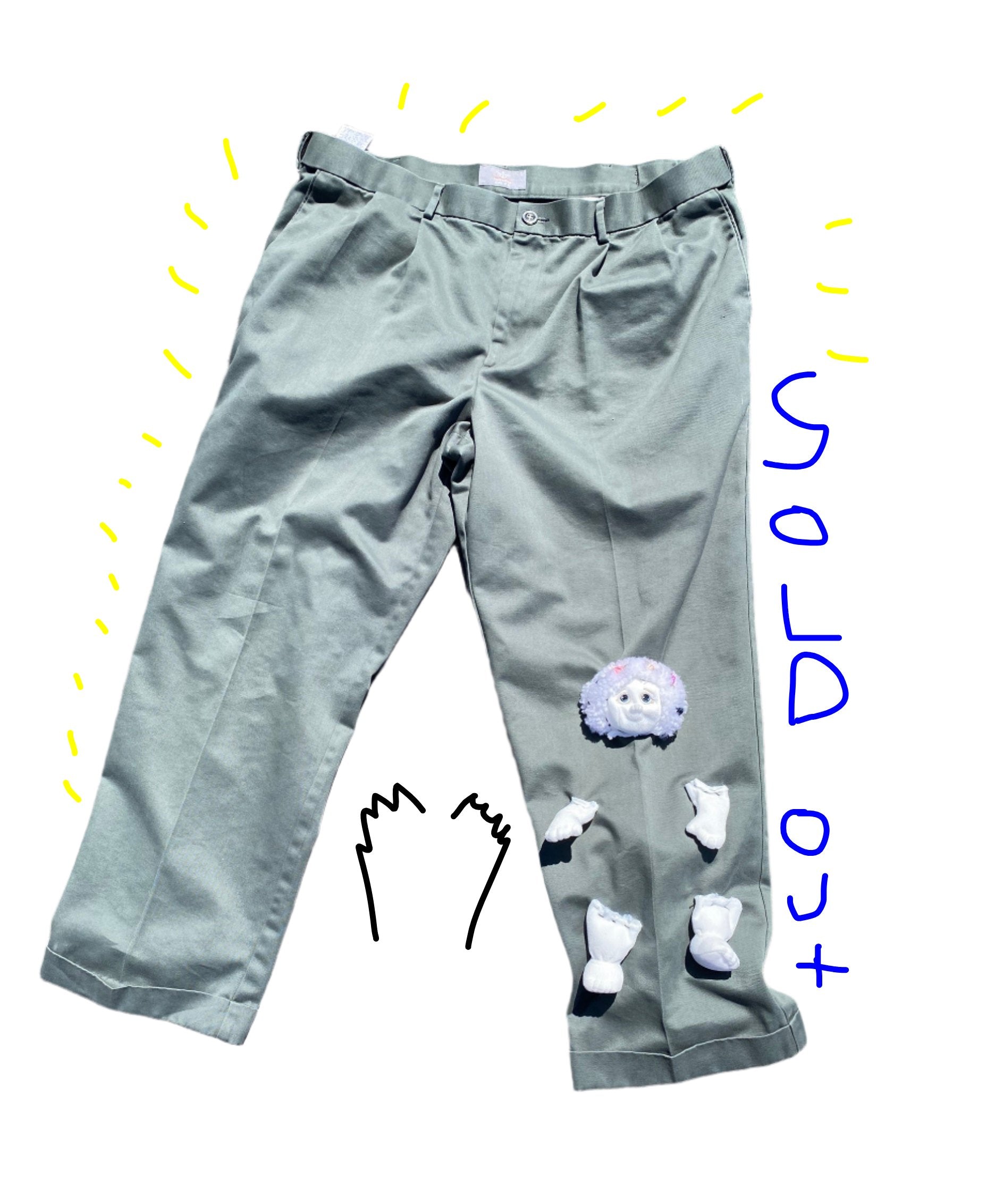 Designed by Mac using a thrifted angel doll and hand sewing it on some nice PANTS !