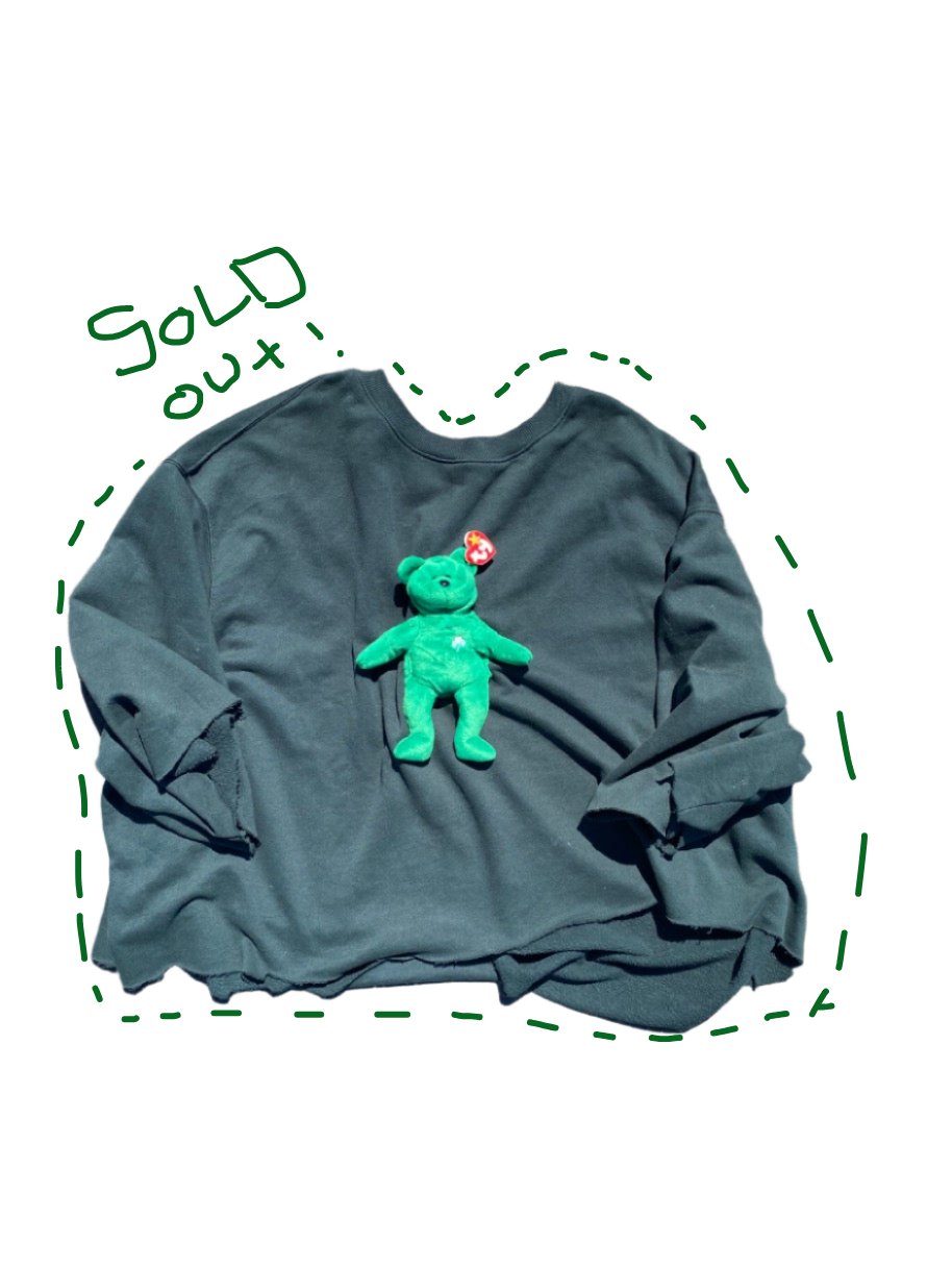 This sweater was a XXXL and I cut it up FYI but this beanie baby is a retired 1997 Erin beanie baby with tag errors, apparently it's fucking rare so I put it on a shirt. The sweater kind of fits like a poncho due to it's size.